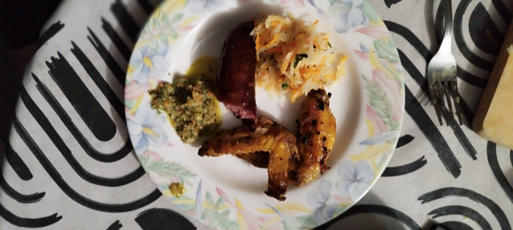 First off marinate the chicken wings in lime juice, grated ginger, grated garlic, turmeric, olive oil and curry powder. Rest for 30 minutes while the oven gets to 160 degrees Celsius, fan. During this time, prepare the salad by julienning a green papaya and a couple of carrots, or using a mandolin with the right attachment. You can also just use a decent cooks knife if you have the knife skills. Wizz up a chutney using half a carrot, half an onion, one glove of diced garlic, 2 birds eye chillis, handful of mint, juice of a lime and it’s zest, glug of olive oil, glug of cider vinegar and a thumb of ginger, salt and pepper. The chicken and sausage will now be ready for the oven, cook for 45 mins. When ready put a tablespoon of the chutney in the salad and combine. Plate up and serve…