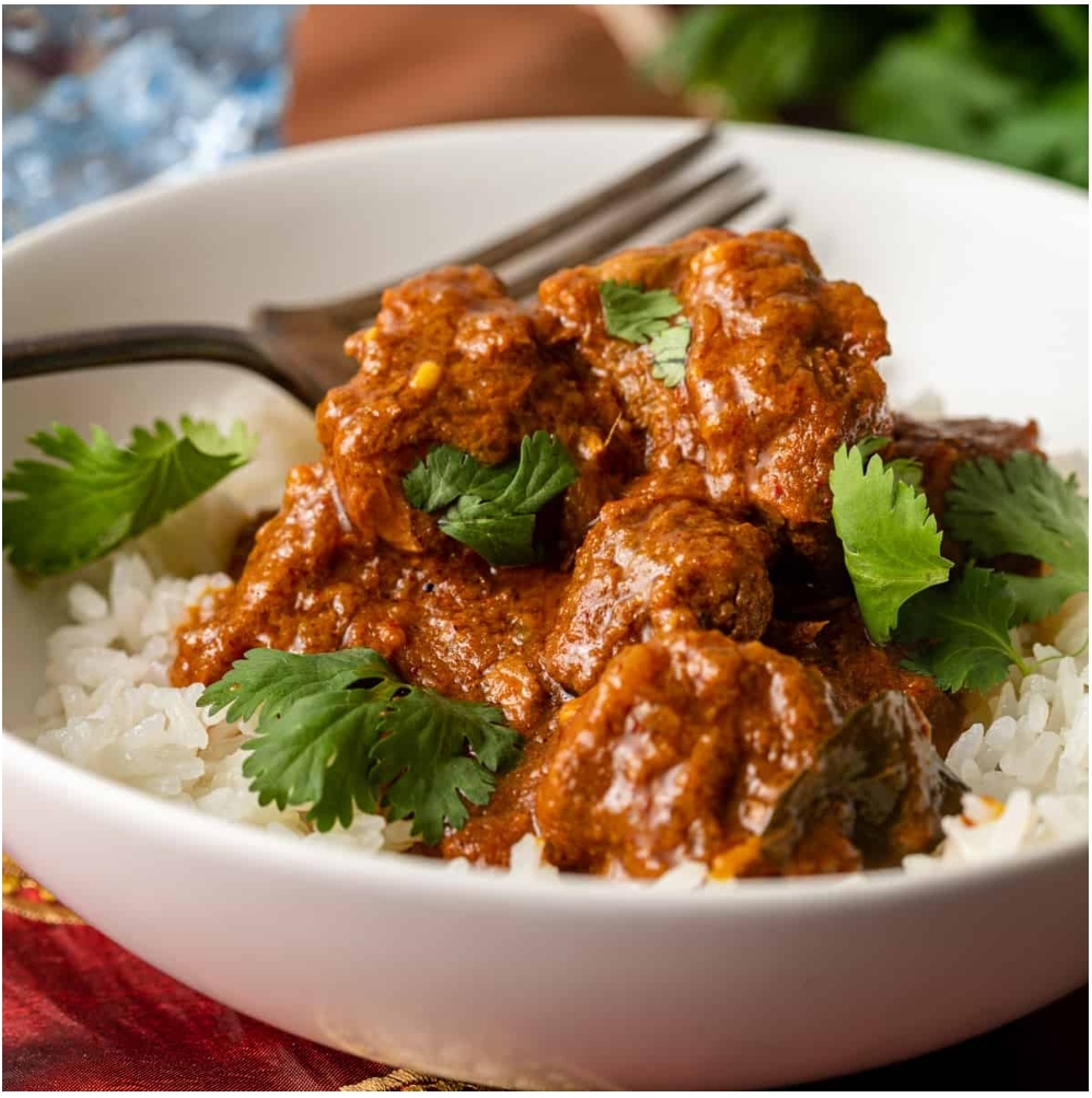 Stir and then immediately add back the meat, the tomatoes and coconut milk and stir. Cover and cook on low heat for 1.5 to 2 hours. Ensure from time to time you check the curry is not drying out. Add some hot water if necessary and stir. Ensure the curry is not catching on the bottom of the pan. With one hour remaining add the potatoes, try not to stir too much from here as it will break up the potatoes. Be gentle and remember to check it’s not catching on the bottom of the pan, no one likes a burnt curry!
